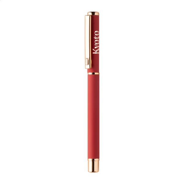 Zestaw długopisów z recyklingowanego aluminium, z długopisem kulkowym i cienkopisem, z gumowanym wykończeniem i detalami w kolorze różowego złota. Z niebieskim wkładem. Ze specjalną powłoką do grawerowania laserowego w kolorze różowego złota. W czarnym papierowym pudełku prezentowym.
