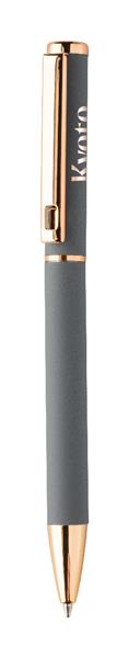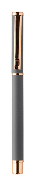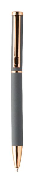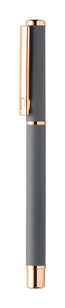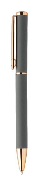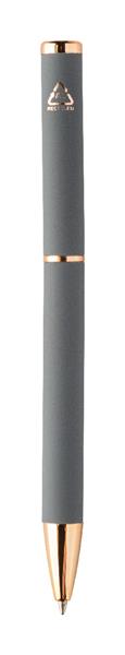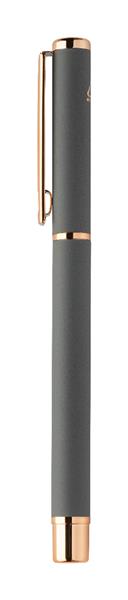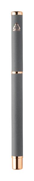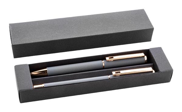 Zestaw długopisów z recyklingowanego aluminium, z długopisem kulkowym i cienkopisem, z gumowanym wykończeniem i detalami w kolorze różowego złota. Z niebieskim wkładem. Ze specjalną powłoką do grawerowania laserowego w kolorze różowego złota. W czarnym papierowym pudełku prezentowym.
