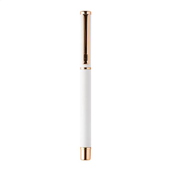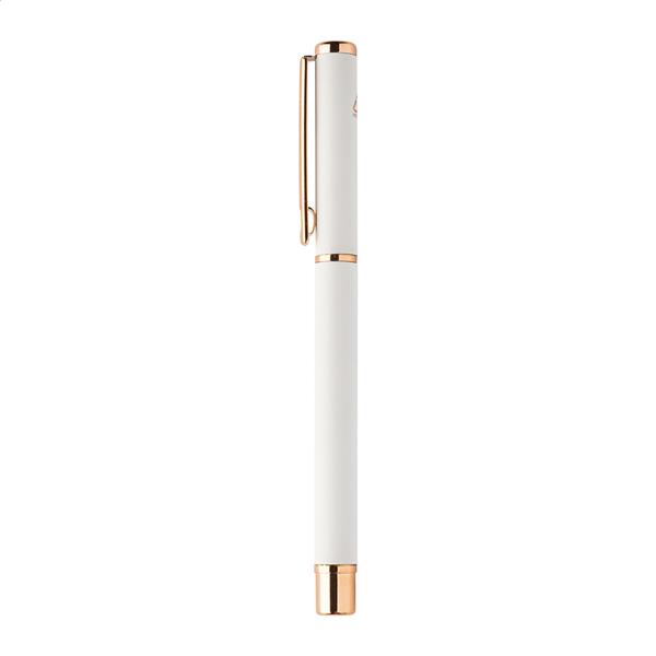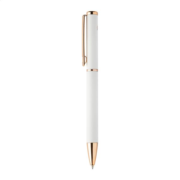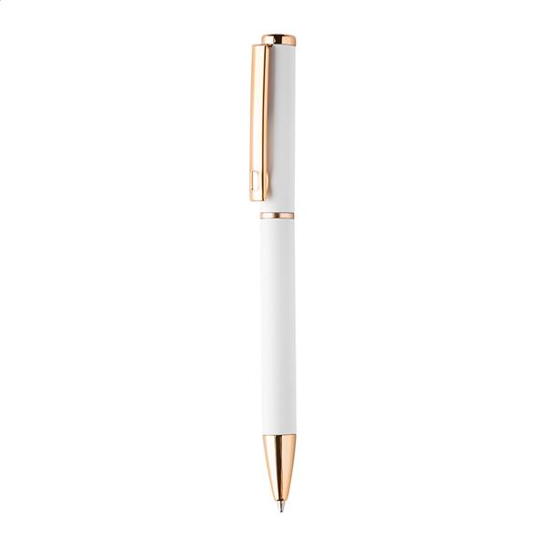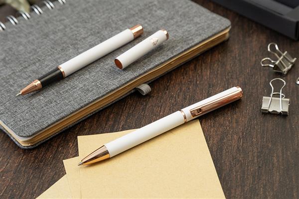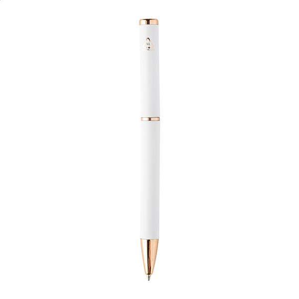 Zestaw długopisów z recyklingowanego aluminium, z długopisem kulkowym i cienkopisem, z gumowanym wykończeniem i detalami w kolorze różowego złota. Z niebieskim wkładem. Ze specjalną powłoką do grawerowania laserowego w kolorze różowego złota. W czarnym papierowym pudełku prezentowym.