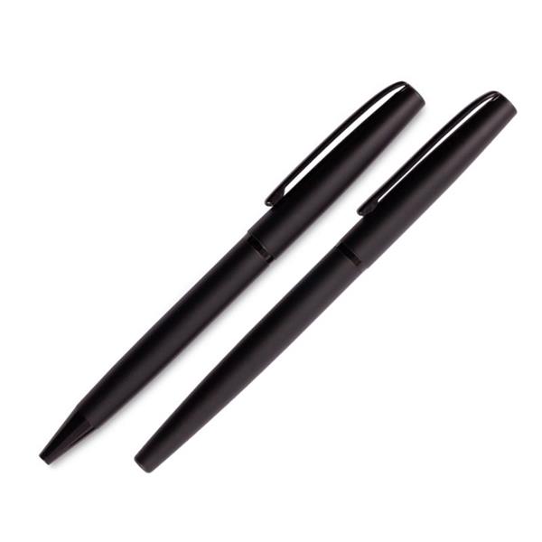 Zestaw piśmienniczy składający się z metalowego pióra kulkowego i długopisu. Wkład w kolorze niebieskim. Pakowany w upominkowe opakowanie.