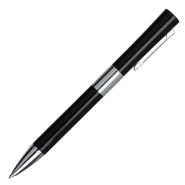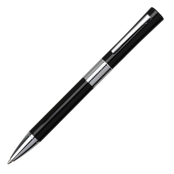 Zestaw składający się z metalowego długopisu i pióra kulkowego zapakowany w eleganckie etui o wypukłej fakturze. Oryginalny kształt klepsydry i połyskująca powierzchnia czynią z tego kompletu doskonały upominek reklamowy. Wkłady w kolorze niebieskim. Obrotowy mechanizm włączania.