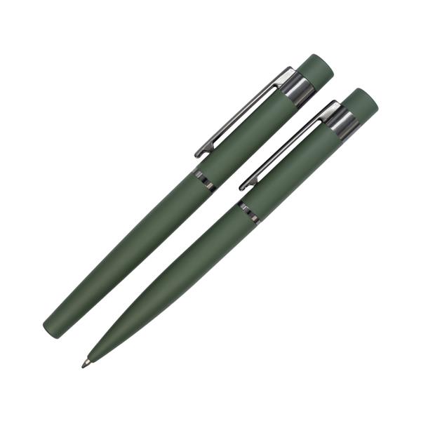 Zestaw piśmienniczy składający się z metalowego pióra kulkowego i długopisu. Wkład w kolorze niebieskim. Zapakowany w upominkowe opakowanie.