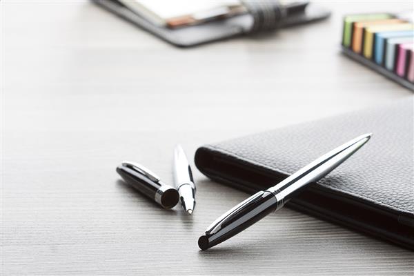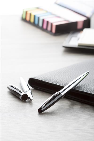Zestaw długopisów (w tym kulkowy) z błyszczącymi wykończeniami. Produkt zapakowany w ozdobne opakowanie.
