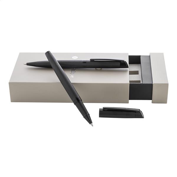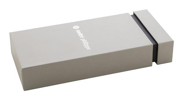 Elegancki, metalowy zestaw składający się z długopisu i pióra kulkowego z teksturowanym korpusem. W dwukolorowym pudełku prezentowym, z niebieskim wkładem. Produkt marki André Philippe.