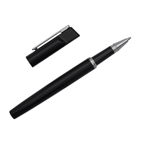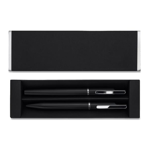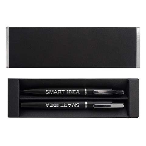 Elegancki zestaw upominkowy składający się z metalowego długopisu i pióra kulkowego. Możliwość wygrawerowania błyszczącego logo, pasującego kolorem do metalowych detali długopisu. Niebieski wkład.