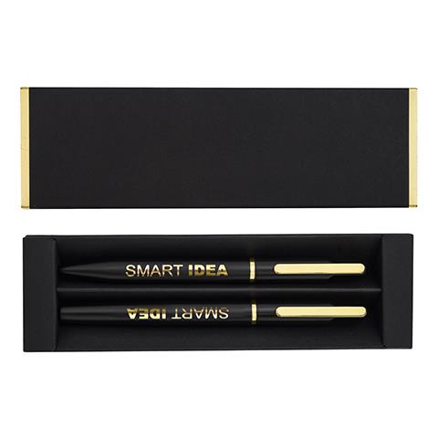 Elegancki zestaw upominkowy składający się z metalowego długopisu i pióra kulkowego. Możliwość wygrawerowania błyszczącego logo, pasującego kolorem do metalowych detali długopisu. Niebieski wkład.