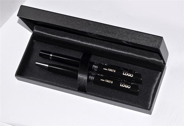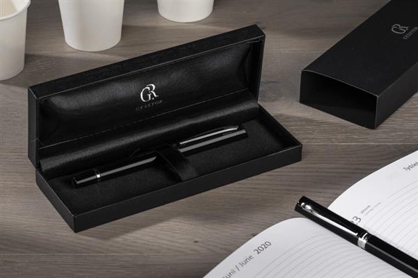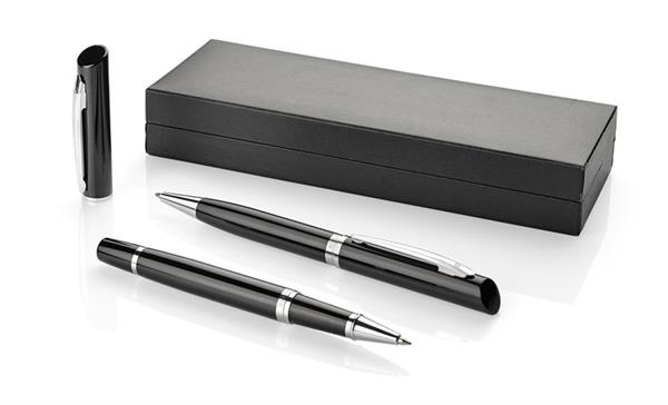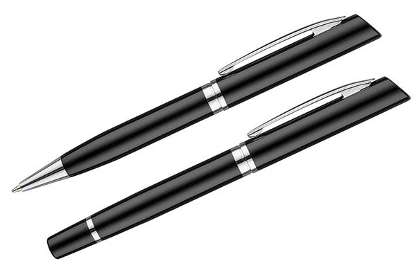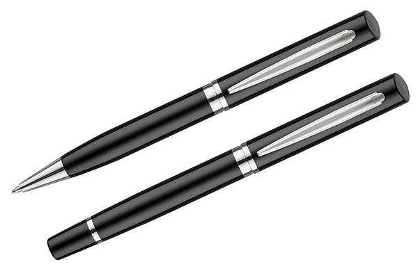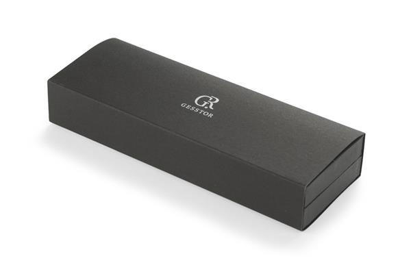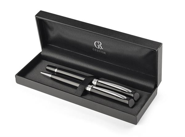 Zestaw piśmienniczy o klasycznej elegancji zawierający długopis oraz pióro kulkowe. Zapakowany w pudełko wykonane z materiału skóropodobnego (PU). Wszystkie elementy zestawu oznaczone subtelnym logo marki GESSTOR oznaczającej produkty o wyjątkowej jakości i pięknym wzornictwie. Wymiar długopisu – 139 x 12mm, wymiar pióra – 138 x 12 mm.