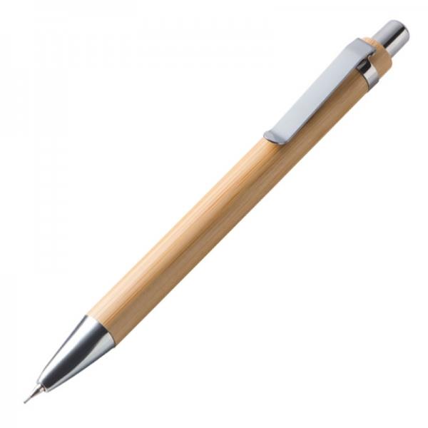 Zestaw piśmienniczy wykonany z drewna, z długopisem piszącym na niebiesko i ołówkiem automatycznym.