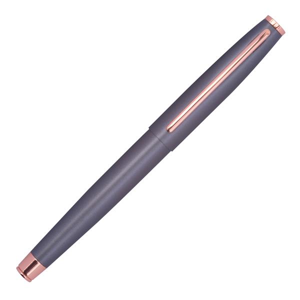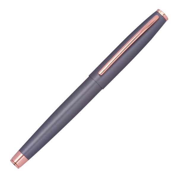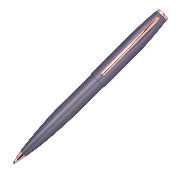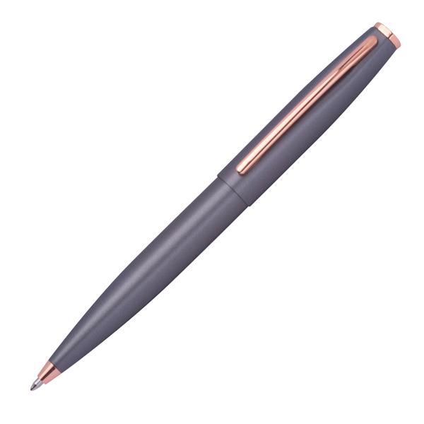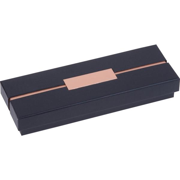Zestaw piśmienniczy CrisMa wykonany z metalu, składający się z obrotowego długopisu (o długości pisania do 800 m) oraz pióra kulkowego (o długości pisania do 500 m), zdobionych różowozłotymi detalami. Oba przybory piszą w kolorze niebieskim i są zapakowane w eleganckie, czarne pudełko.