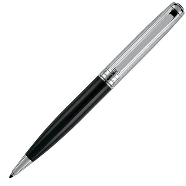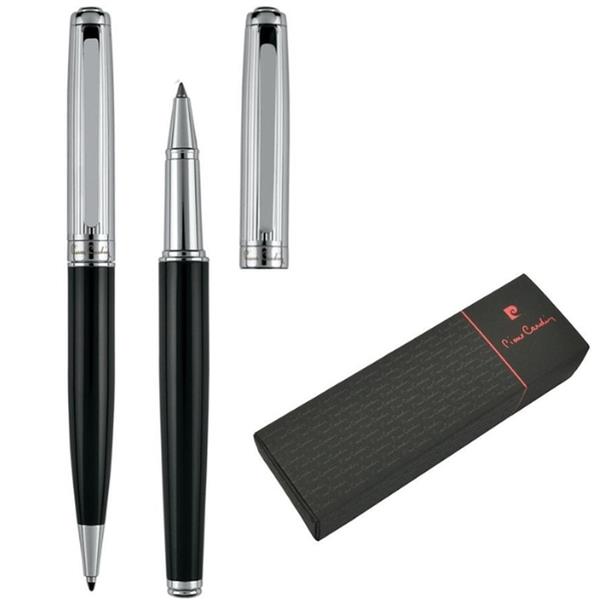 Elegancki Zestaw piśmienniczy składający się z długopisu i pióra kulkowego. Korpusy wykonano z czarnego, lakierowanego metalu i wzbogacono o srebrne detale. Obydwa artykuły posiadają wysokiej jakości wkłady piszące na niebiesko (długopis 1 mm, pióro kulkowe 0,6 mm) oraz zapasowe wkłady piszące na czarno. Całość zapakowana w eleganckie pudełko prezentowe z certyfikatem autentyczności Pierre Cardin.
