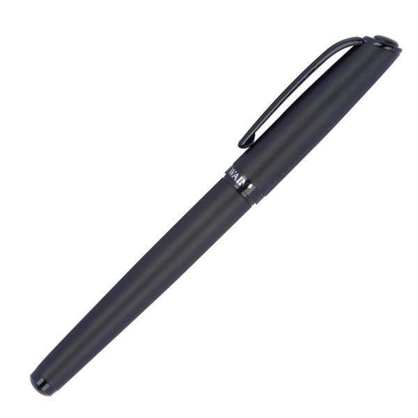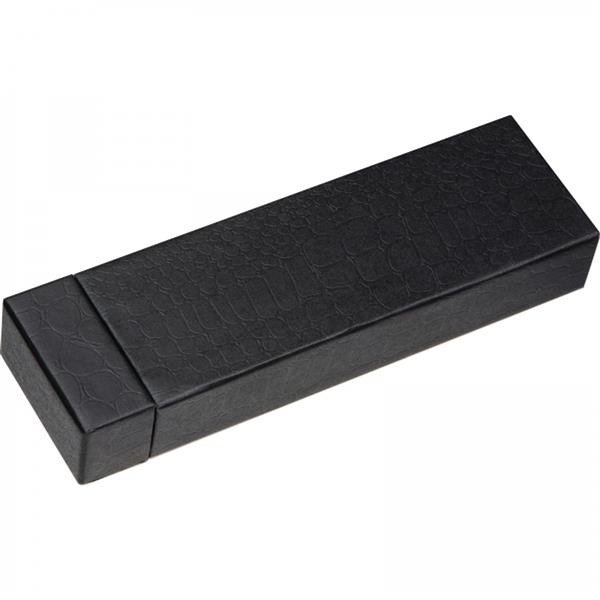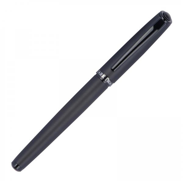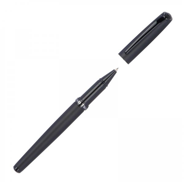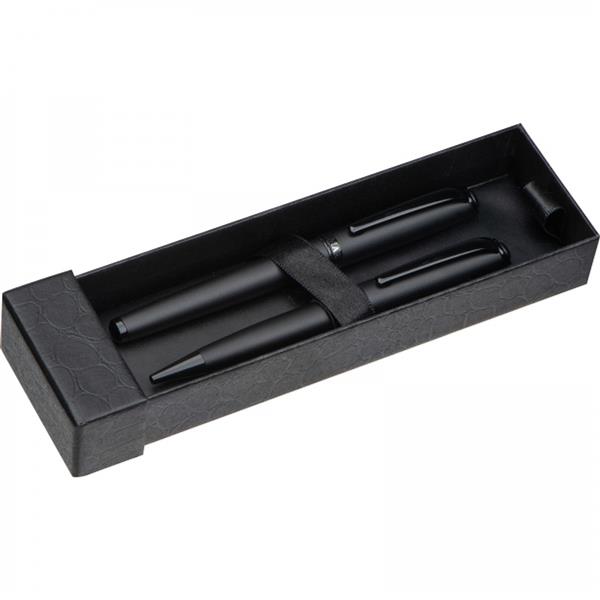 Zestaw piśmienniczy marki Mark Twain, składający się z długopisu z mechanizmem obrotowym z wkładem w kolorze niebieskim oraz pióra kulkowego piszącego na czarno. Oba przyrządy mają czarną, matową obudowę oraz błyszczące czarne wstawki. Pakowane w etui wyściełane satyną.