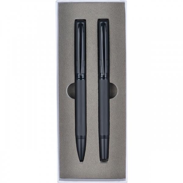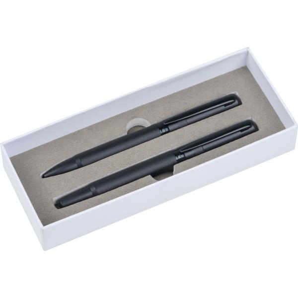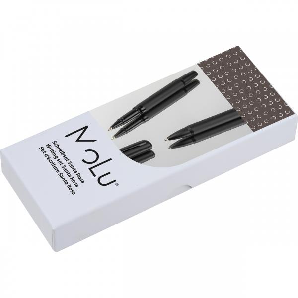Wysokiej jakości zestaw do pisania składający się z pióra kulkowego i przekręcanego długopisu o eleganckim wyglądzie. Ozdobne logo MoLu zostało wydrukowane w kolorze matowej czerni na czarnym pierścieniu.