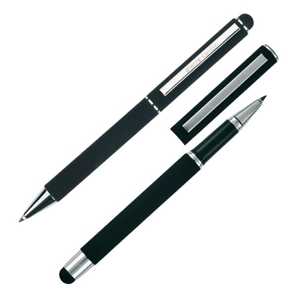 Luksusowy Zestaw piśmienniczy składający się z długopisu i pióra kulkowego wykonanych z aluminium, z przyjemną w dotyku powierzchnią soft touch i srebrnymi detalami. Długopis wyposażony w niebieski wkład 0,7 mm, natomiast pióro w niemiecki wkład Schneider w kolorze niebieskim 0,5 mm. Obydwa elementy posiadają funkcję touch pen. Całość zapakowana w eleganckie etui prezentowe z certyfikatem autentyczności Pierre Cardin.