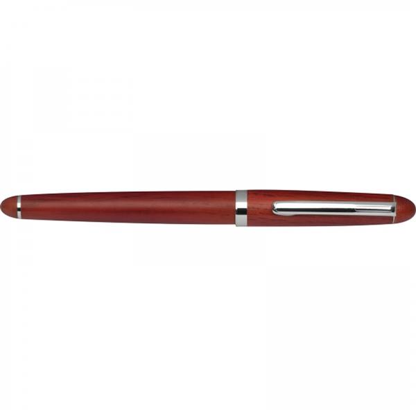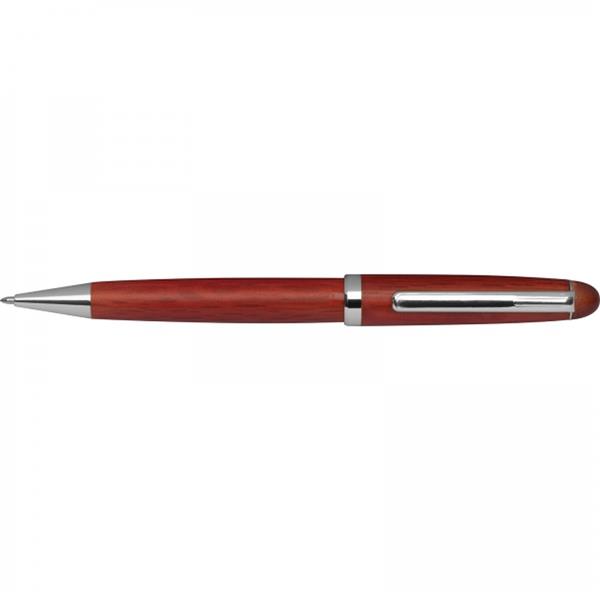 Zestaw składający się z długopisu z niebieskim wkładem oraz z pióra wiecznego z dołączonym niebieskim nabojem. Funkcjonalne pudełko z drewna różanego po zamknięciu może służyć jako podstawka.