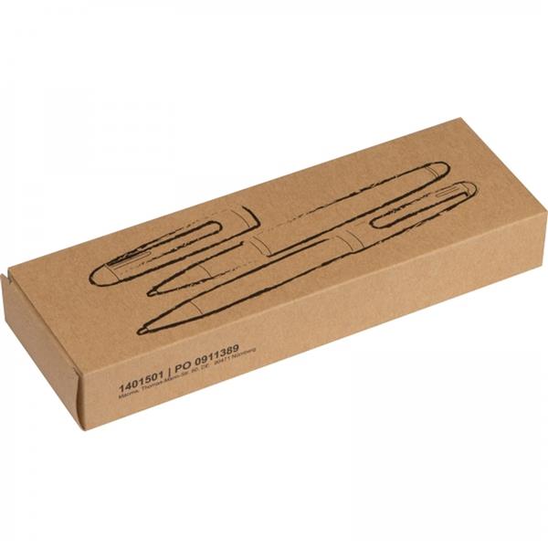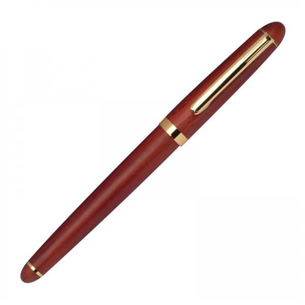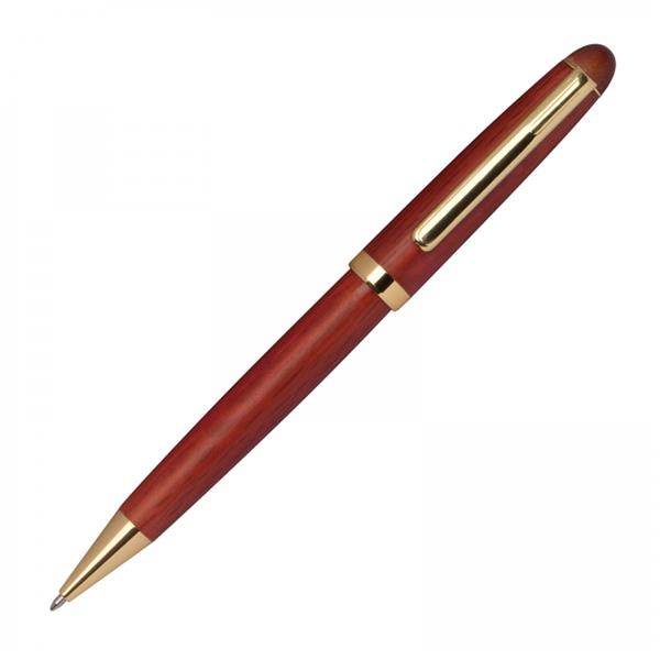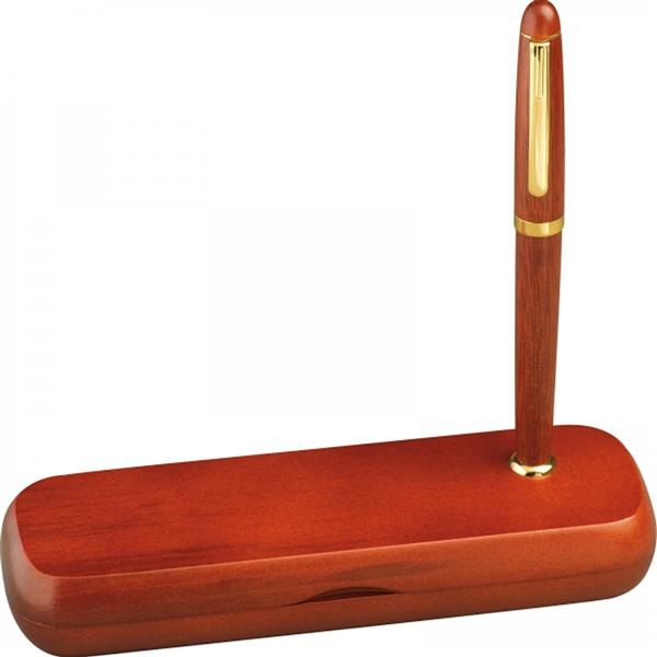 Zestaw składający się z długopisu z niebieskim wkładem oraz pióra wiecznego z dołączonym niebieskim nabojem. Funkcjonalne pudełko z drewna różanego po zamknięciu może służyć jako podstawka.