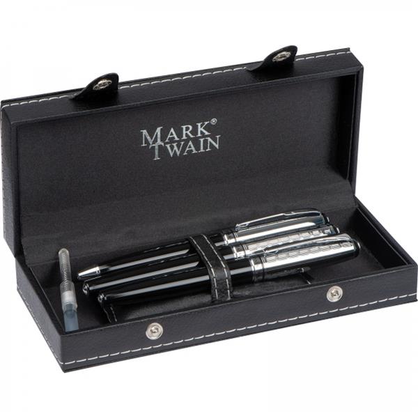 Zestaw piśmienniczy marki Mark Twain składający się z pióra wiecznego z nabojem, długopisu piszącego na czarno oraz pióra kulkowego piszącego na niebiesko. Całość umieszczona w gustownym etui.