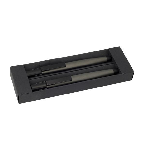 Zestaw składa się z długopisu i ołówka automatycznego. Długopis pisze na czarno. Całość pakowana w czarne pudełko z papieru. Rozmiar rysika: 0,7 mm.