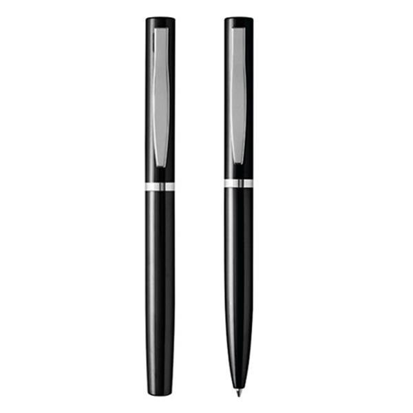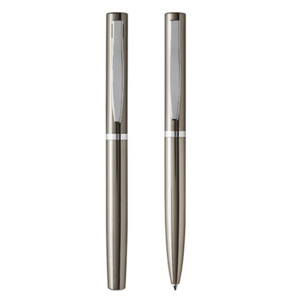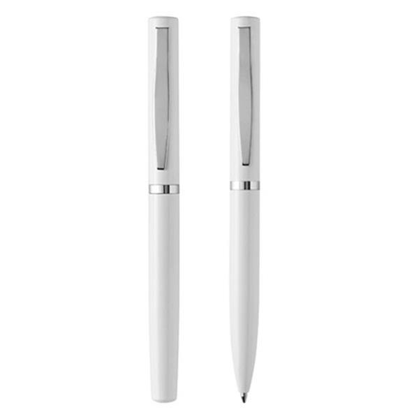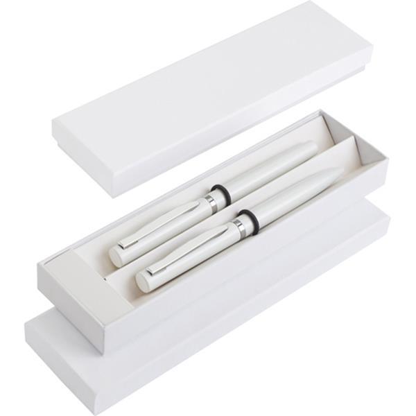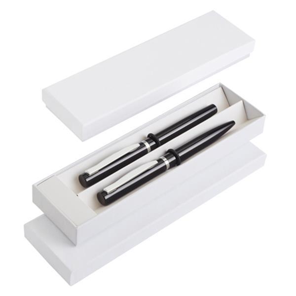 Długopis (mechanizm obracany) i pióro kulkowe (z zatyczką) wykończone chromowanymi elementami, które nadają produktom klasycznego charakteru oraz lekkości. Zarówno długopis, jak i pióro posiadają wkłady piszące na czarno. Wszystko zapakowane jest w eleganckie białe pudełko wykonane z papieru.