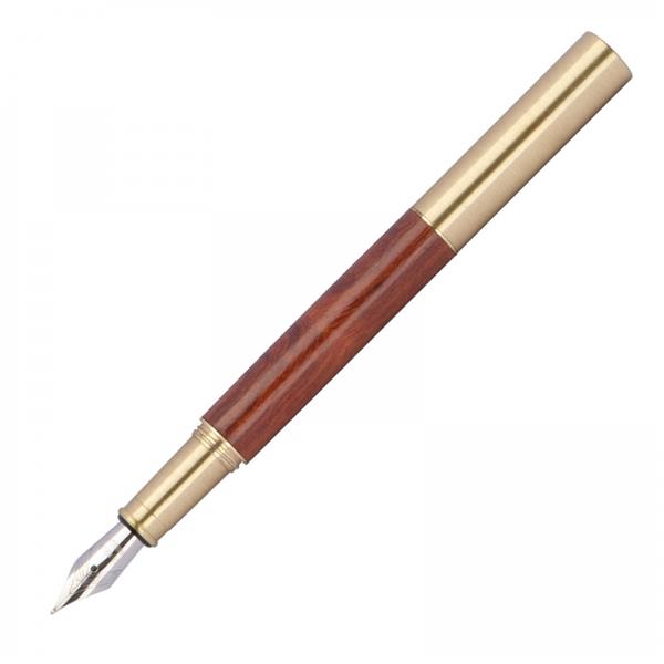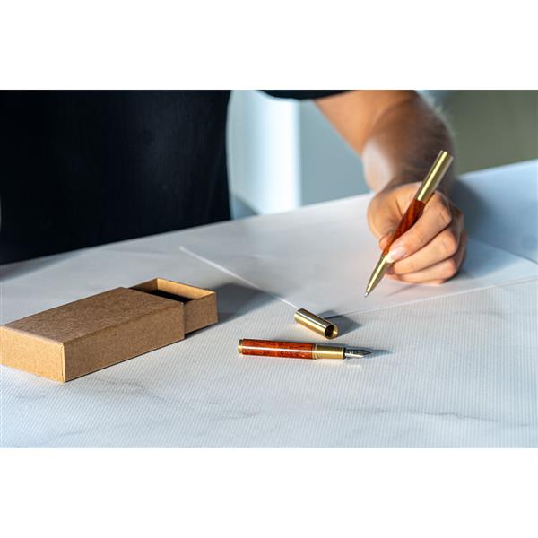 Zestaw w rozmiarze mini, wykonany z drewna i mosiądzu. W kartonowym opakowaniu prezentowym znajdziemy pióro wieczne oraz pióro kulkowe. Zatyczki są zakręcane i można doczepić je na końcu pióra jako przedłużenie jego długości (zwiększa wygodę pisania).