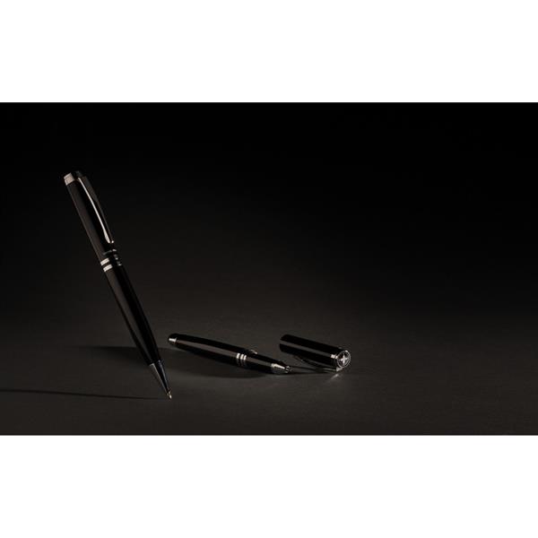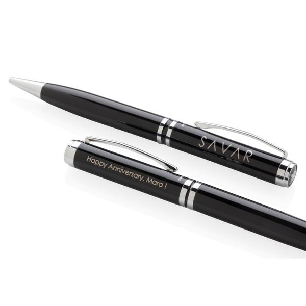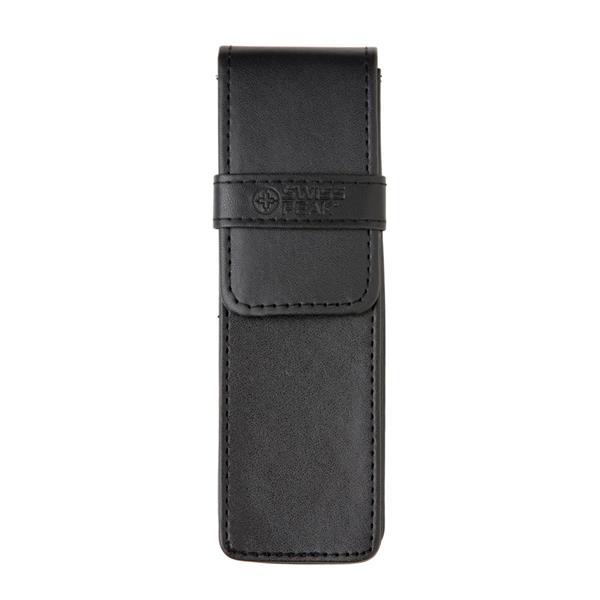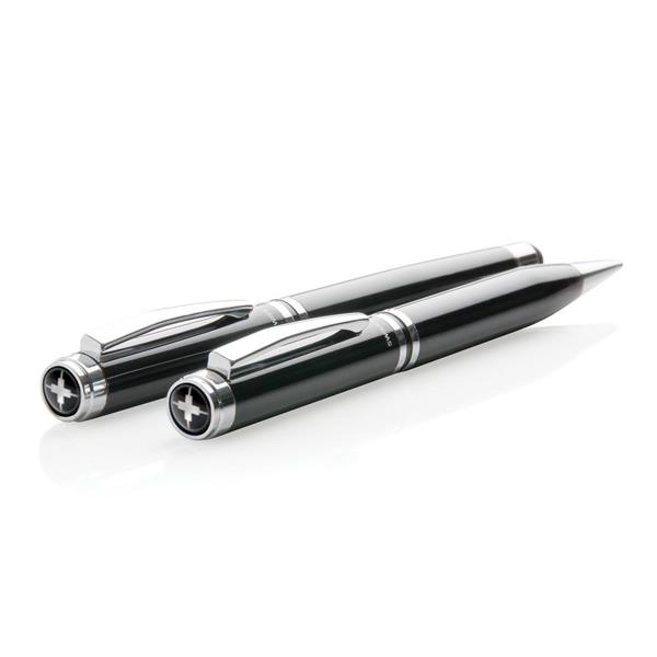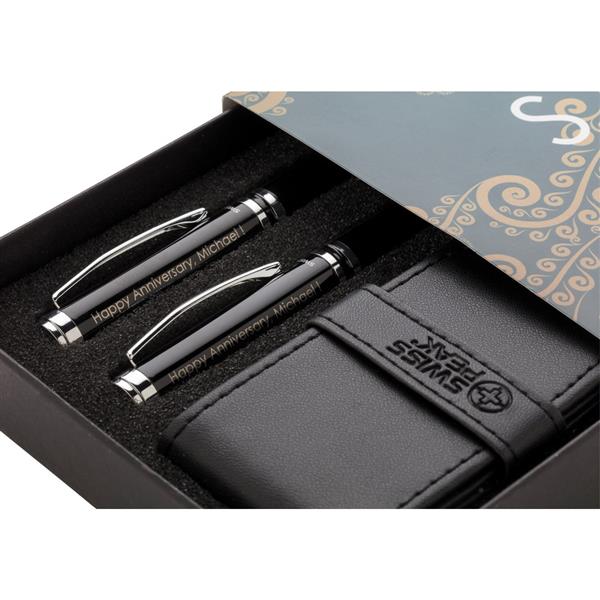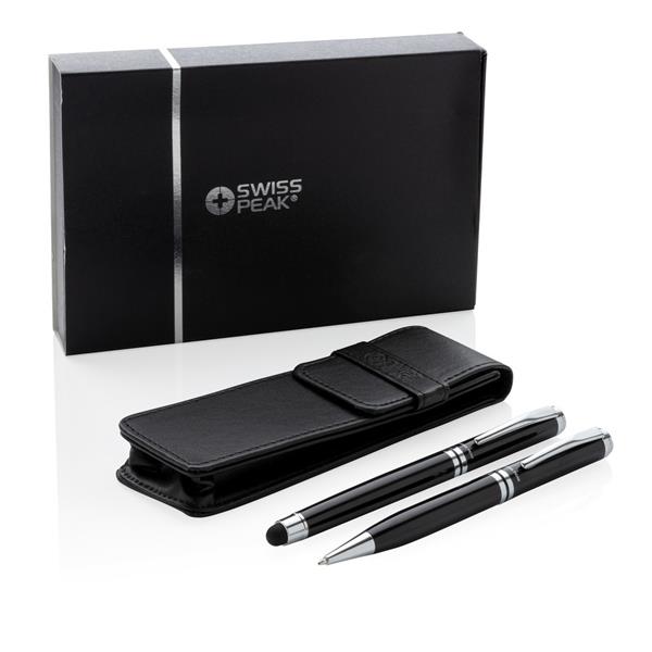 Ekskluzywny zestaw piśmienny, wykonane z mosiądzu pióro kulkowe z touch penem oraz długopis z logotypem Swiss Peak, niebieski wkład, pokrowiec PU oraz pudełko podarunkowe w komplecie, ślad węglowy produktu: 0,54 kg CO2