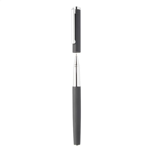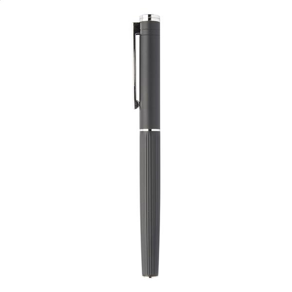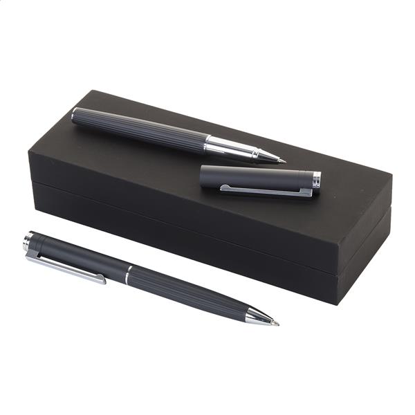 Elegancki, aluminiowy zestaw piśmnienniczy zawierający długopis i pióro kulkowe z teksturowanym korpusem w paski. W czarnym pudełku upominkowym z niebieskim wkładem.