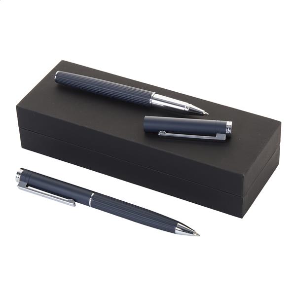 Elegancki, aluminiowy zestaw piśmnienniczy zawierający długopis i pióro kulkowe z teksturowanym korpusem w paski. W czarnym pudełku upominkowym z niebieskim wkładem.