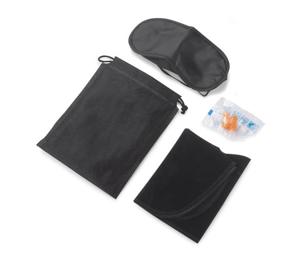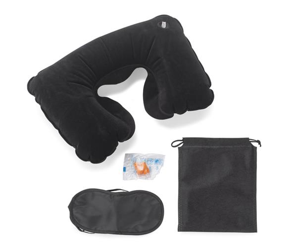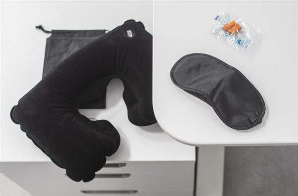 Zestaw podróżny CINO składa się z 3 elementów: opaski na oczy, 2 sztuk zatyczek do uszu i dmuchanej poduszki, która pokryta jest przyjemnym w dotyku materiałem. Zajmuje mało miejsca dzięki czemu produkt ten z łatwością możemy zapakować do bagażu podręcznego. Jest lekki i wygodny w użyciu. Z pewnością umili nie jedną podróż. Zestaw zapakowany jest w czarny woreczek.