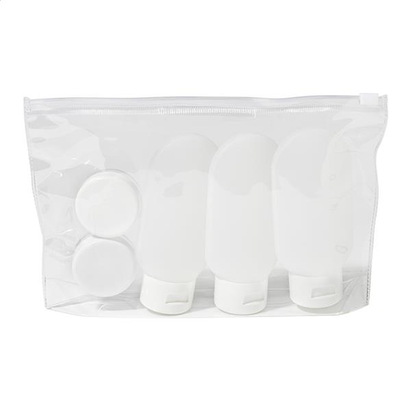 Zestaw podróżny na kosmetyki zapinanym na suwak, przezroczystym woreczkiem z PVC i 5 pojemnikami do ponownego napełniania. Zawiera 3 butelki (60 ml) i 2 słoiczki (10 ml). Idealny do uporządkowania kosmetyków podczas kontroli bezpieczeństwa na lotnisku.