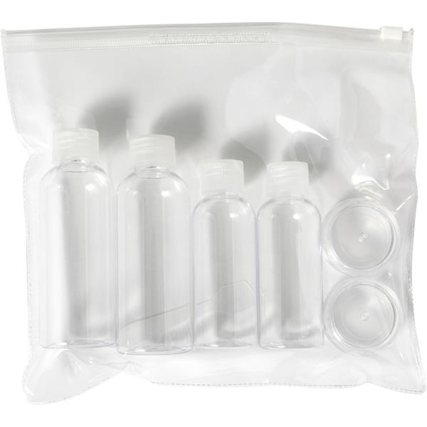 Zestaw podróżny w przezroczystym opakowaniu, 2 butelki 100 ml, 2 butelki 50 ml, 2 pojemniki 10 ml, 1 łopatka