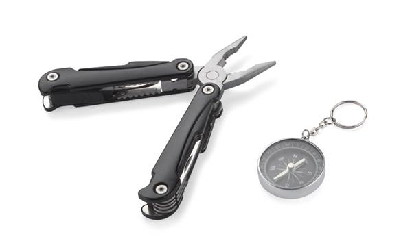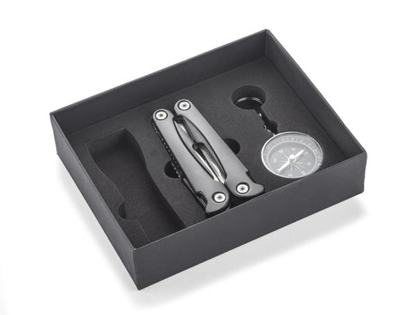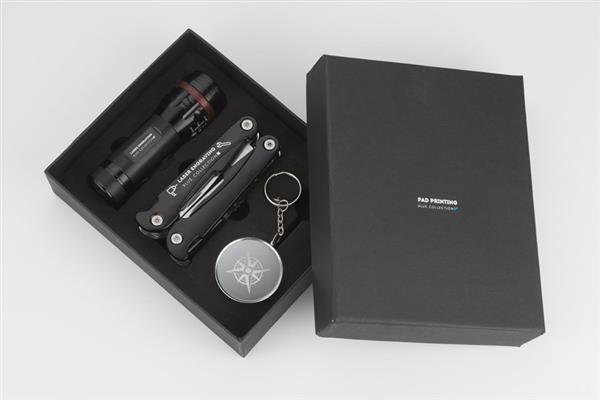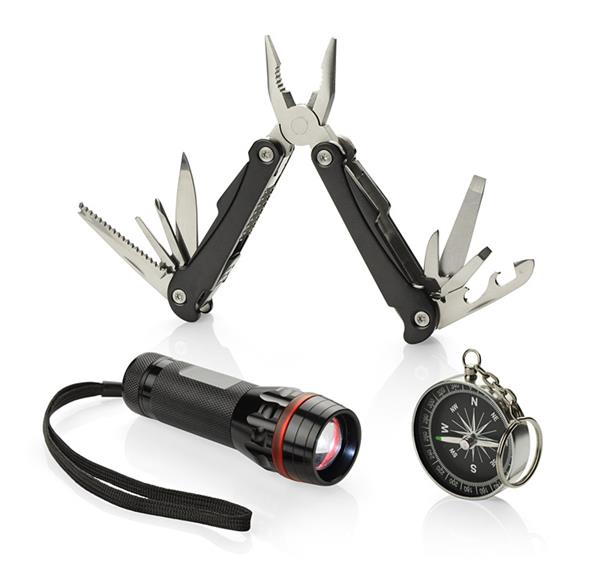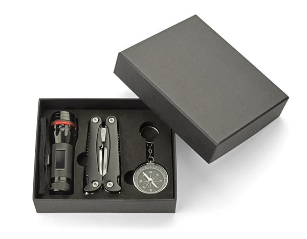 Zestaw upominkowy zawierający latarkę, narzędzie wielofunkcyjne oraz kompas. Latarka posiada bardzo jasną diodę, możliwość regulacji wiązki światła oraz 3 tryby świecenia: mocny, słaby oraz migający. Każdy element jest wykonany z metalu a całość zapakowana w eleganckie czarne pudełko.