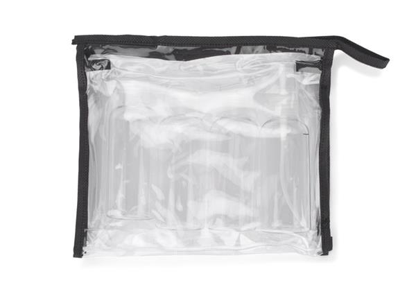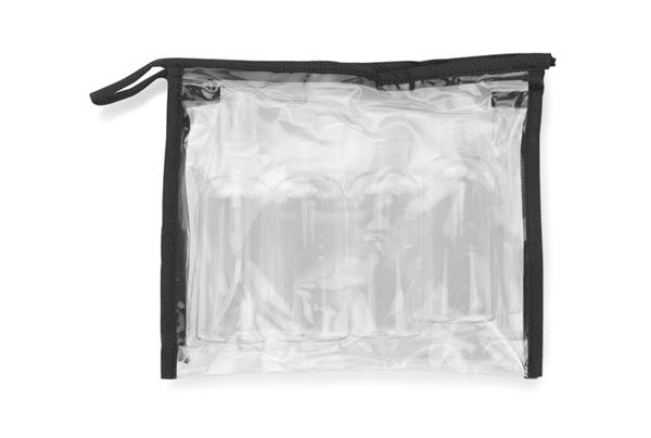Zestaw podróżnych pojemników to gadżet przydatny w czasie podróży. Pozwala na zabranie swoich ulubionych kosmetyków w mniejszych buteleczkach. Zestaw zawiera 4 buteleczki o pojemności 80 ml, w tym jedną ze spryskiwaczem oraz lejek ułatwiający przelewanie kosmetyków.