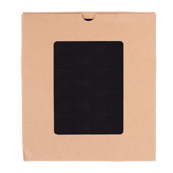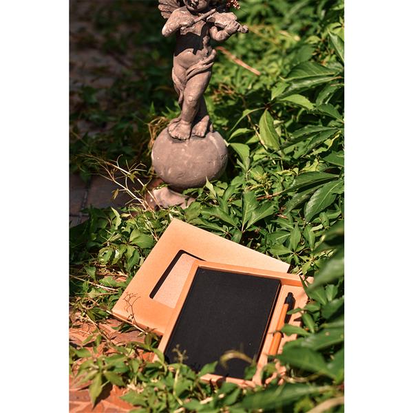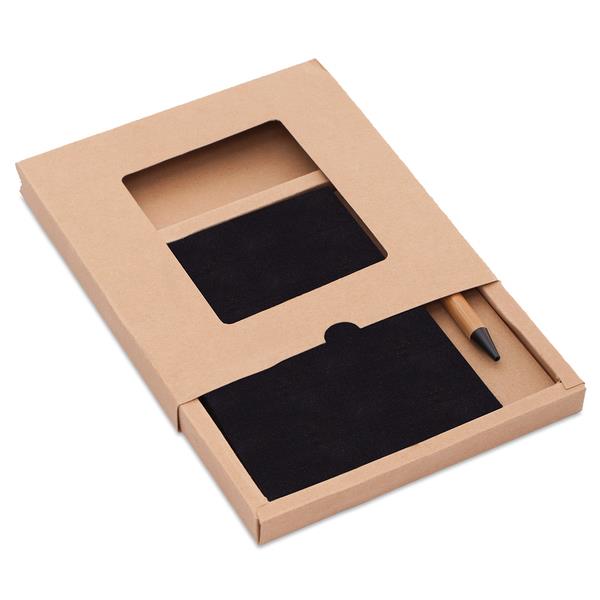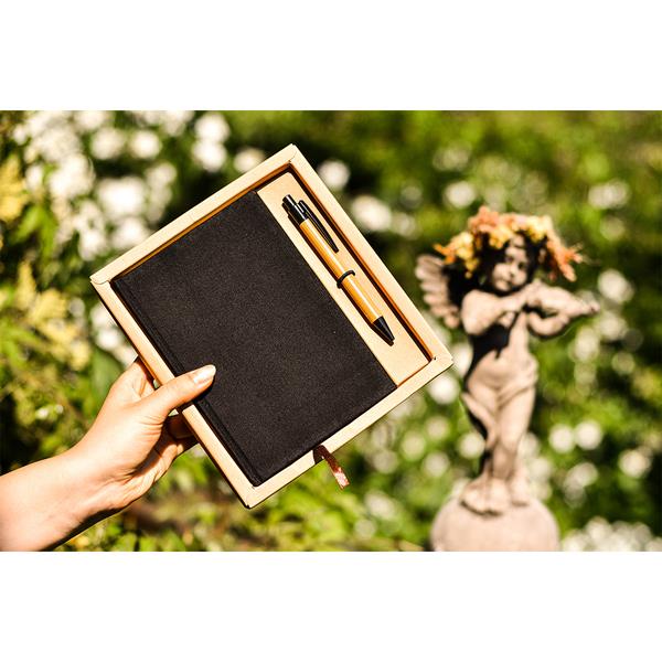 Zestaw składający się z notesu w lnianej, drukowanej okładce (90 kartek w kratkę, 80 g/m2) oraz długopisu bambusowego z plastikową skuwką, przyciskiem i końcówką wyposażonego w wkład koloru niebieskiego. Pakowany w kartonowe pudełko.