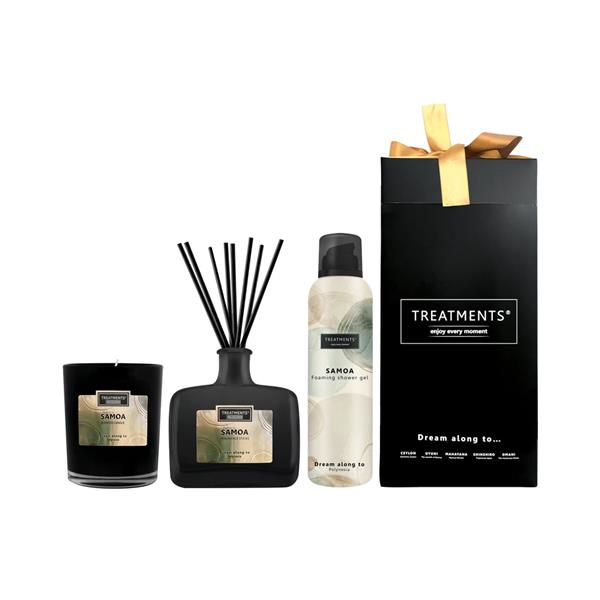 Zestaw prezentowy Home & Body DeLuxe TREATMENTS, w zestawie znajduje się świeczka zapachowa 380 gr, patyczki zapachowe 200 ml, pieniący się żel pod prysznic 200ml przeznaczony dla kobiet i mężczyzn, elegancki, papierowy kartonik, zestaw wprowadzi do łazienki niepowatarzalną atmosferę, dostępne są różne warianty zapachowe: 08 – Omani, 16 – Zhejinag, 98 – Samoa. Znakowanie produktu jest możliwe tylko na srebrnej lub złotej folii z czarnym nadrukiem albo na czarnej apli ze srebrnym lub złotym nadrukiem.