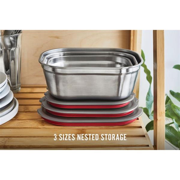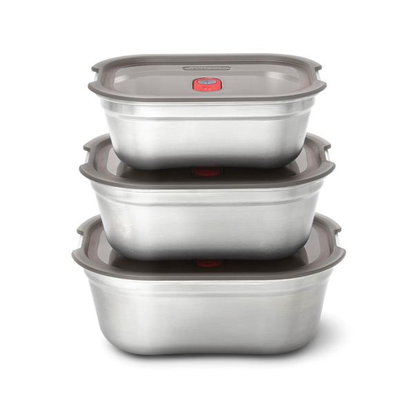 Zestaw pudełek śniadaniowych, w komplecie 3 pudełka w różnych rozmiarach (małe, średnie i duże), szczelne zamknięcia z blokadą, można myć w zmywarce i używać w piekarniku