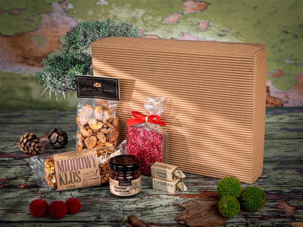 Minimalna ilość zamówienia 50 szt. Słodka przygoda smaków to paczka pełna pyszności! Zawiera batonik miodowy z jagodą i maliną (80 g), czekoladkę mleczną/ciemną z liofilizowanymi malinami (20 g), powidła śliwkowe z miodem (40 g), krówki miodowe (2 szt.) oraz prażone orzechy nerkowca (70 g). Całość zapakowana w eleganckie opakowanie, gotowa na każdą słodką chwilę!