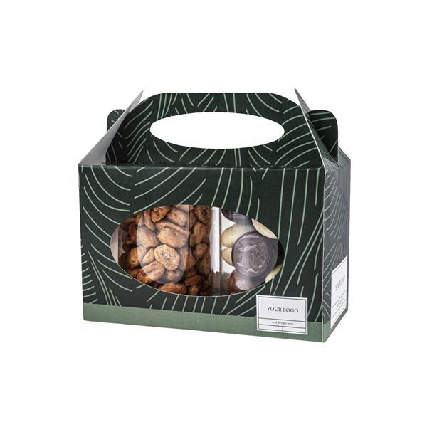 Słodycze zostały zamknięte w puszkach, co pozwala dłużej zachować świeżość produktów. Puszki włożyliśmy zaś w papierowe opakowanie z uchwytem przypominające torebkę, co ułatwia wręczanie Twojego słodkiego upominku i zapewnia jego apetyczną prezentację. Opakowanie dostępne jest w dwóch rodzajach papieru do wyboru: białym i kraft oraz może być w pełni spersonalizowane za pomocą nadruku cyfrowego!