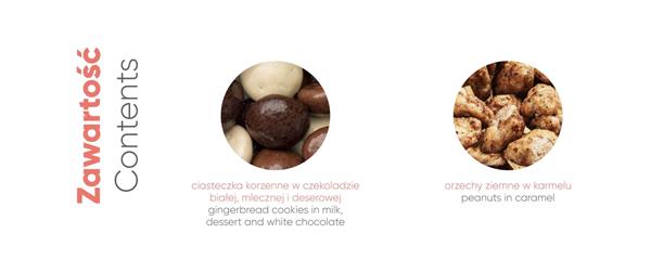 W zestawie znajdują się 2 rodzaje słodyczy: chrupiące orzeszki w karmelu oraz kruche ciasteczka korzenne w trzech rodzajach czekolady – mlecznej, białej i deserowej.