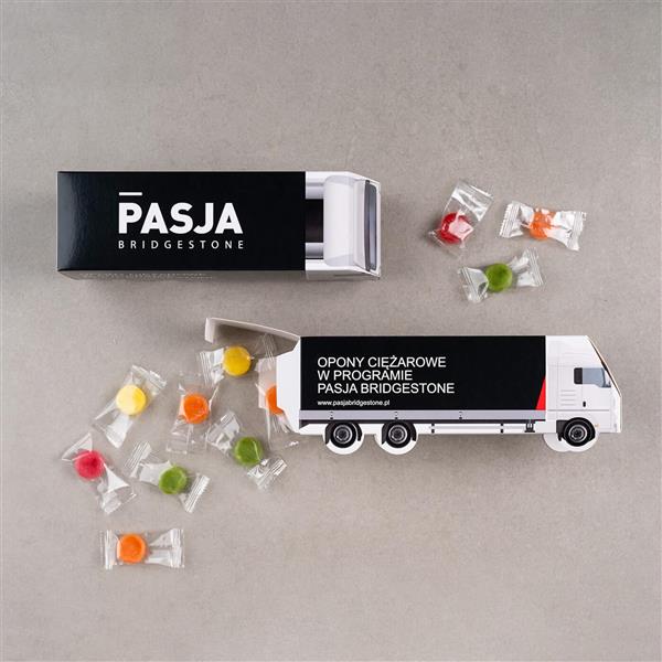 Cukierki z logo firmy w ciężarówce maxi to Twoja firmowa wizytówka. Stworzymy dla Ciebie indywidualną szatę graficzną, która w pełni odzwierciedli charakter Twojej firmy.