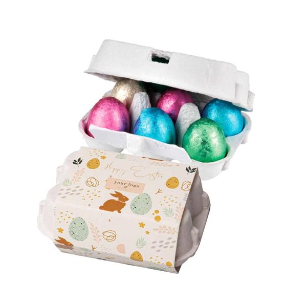Te 6 pisanek z mlecznej czekolady nadzianych po brzegi kremem orzechowym, w klasycznym pudełeczku na jajka, zdecydowanie sprawi, że Twoja marka wyróżni się kreatywnym prezentem.