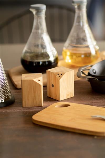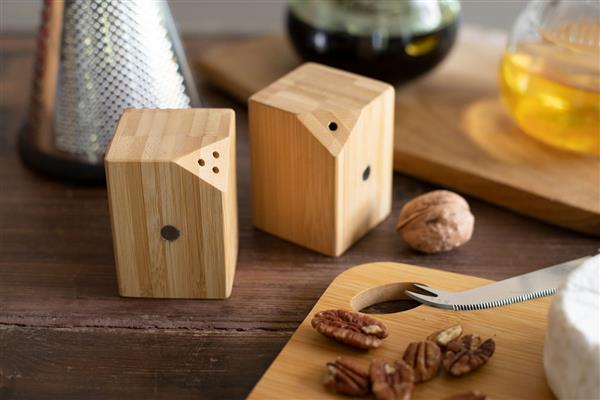 Bambusowy zestaw składający się z solniczki i pieprzniczki. Zestaw zawiera wbudowane magnesy w celu łatwiejszego przechowywania.