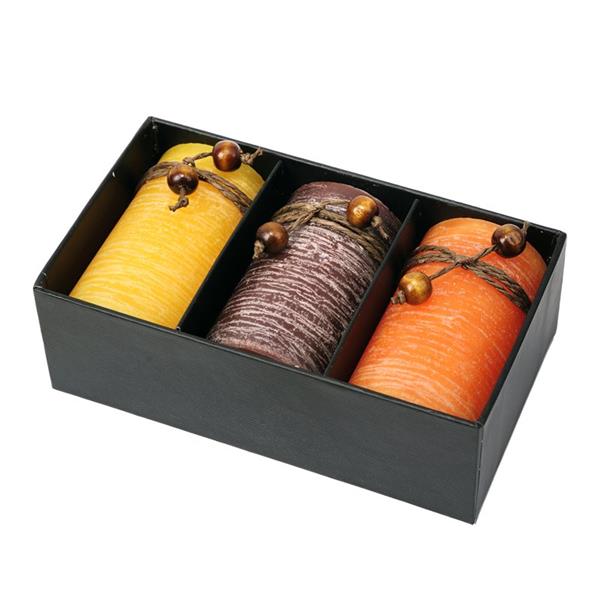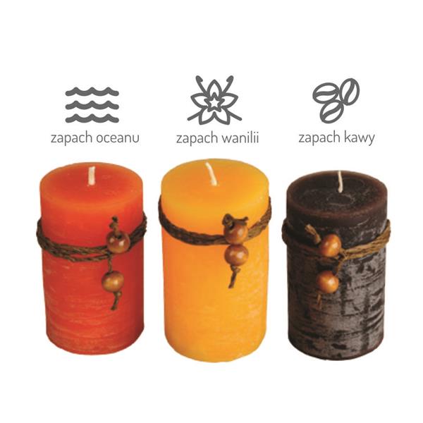 Zestaw świec zapachowych (zapach wanilii, kawy i oceanu) w kartonowym opakowaniu upominkowym i pokrywką pokrytą tłoczonym papierem. Czas palenia 16 godzin.