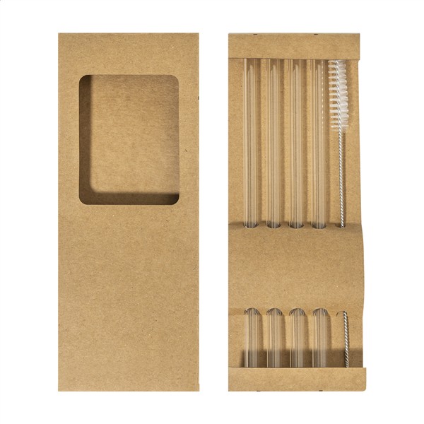 Zestaw 4 słomek do napojów wielokrotnego użytku ze szkła borokrzemianowego ze szczoteczką do czyszczenia. W pudełku z papieru typu kraft.