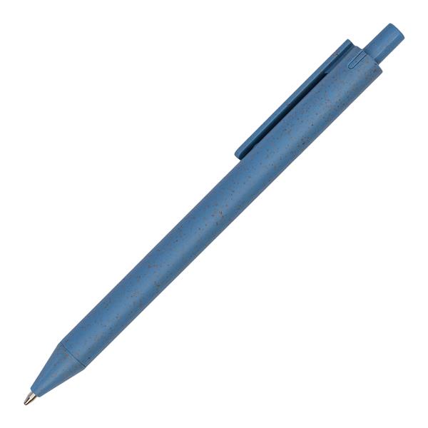 Zestaw szkolno-biurowy ze słomy pszenicznej. Składa się z długopisu, ołówka automatycznego, linijki i gumki. Całość zapakowana w pudełko. Niebieski wkład.