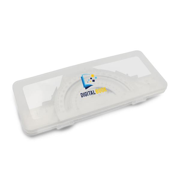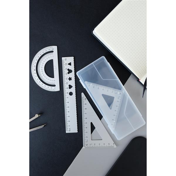 Zestaw szkolny, linijka, 2 ekierki i kątomierz w pudełku o mlecznobiałym wykończeniu, produkt wykonany ze stopu aluminium oraz plastiku