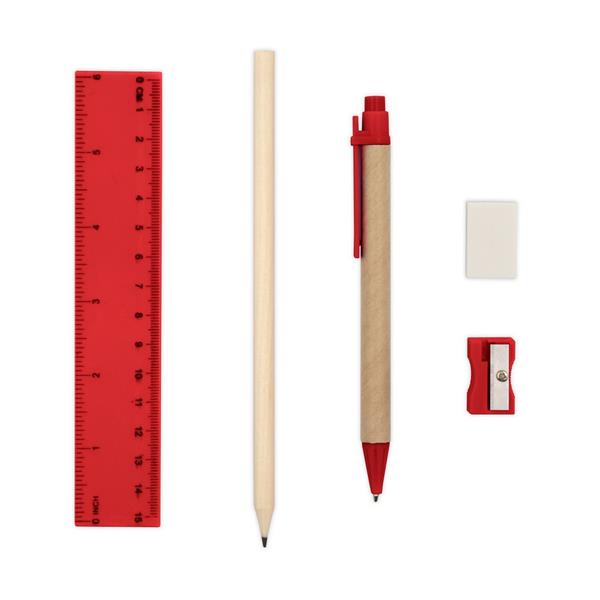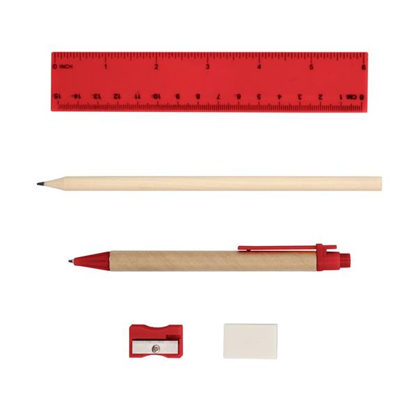 Zestaw szkolny w pudełku, w komplecie znajduje się: ołówek, długopis z trzonem z kartonu z recyklingu (wkład w niebieskim kolorze), linijka (15 cm / 6 cali), gumka oraz temperówka, produkt wykonany z kartonu z recyklingu