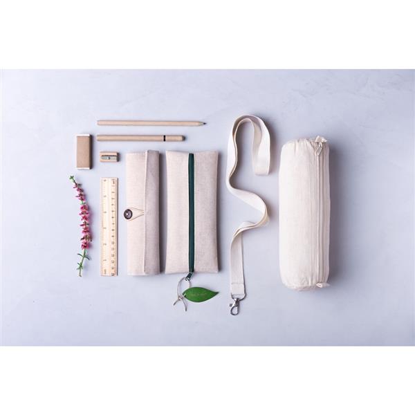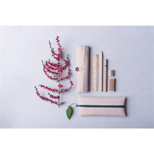 Zestaw szkolny w piórniku zamykanym na zamek błyskawiczny, w komplecie znajduje się: ołówek (nienaostrzony), długopis z wkładem w niebieskim kolorze, linijka (15 cm / 6 cali), gumka oraz temperówka, produkt wykonany między innymi z bawełny i drewna