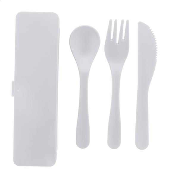 Zestaw 3 sztućców z tworzywa PP w pasującym kolorowym etui. Zawiera widelec, nóż i łyżkę.