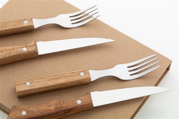 4-częściowy zestaw sztućców do steków ze stali nierdzewnej z rączkami z drewna akacjowego (2 noże do steków, 2 widelce). W pudełku w kształcie książki z papieru kraft.
