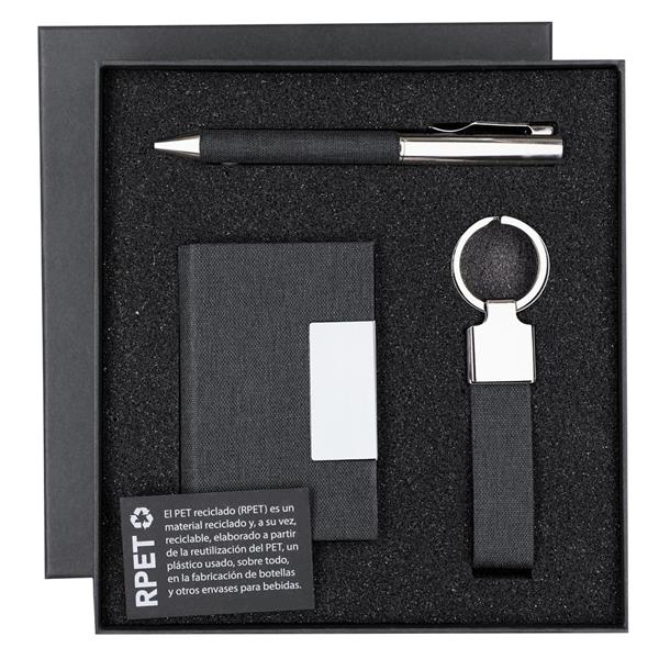 Zestaw upominkowy, w zestawie brelok oraz etui na kartę kredytową z 1 przegrodą, długopis posiada wkład w niebieskim kolorze, czarne pudełko podarunkowe w komplecie, produkt wykonany z poliestru RPET oraz metalu