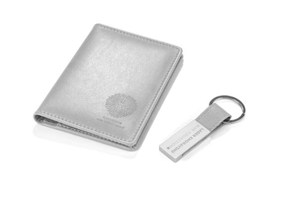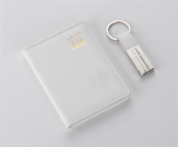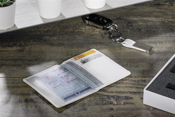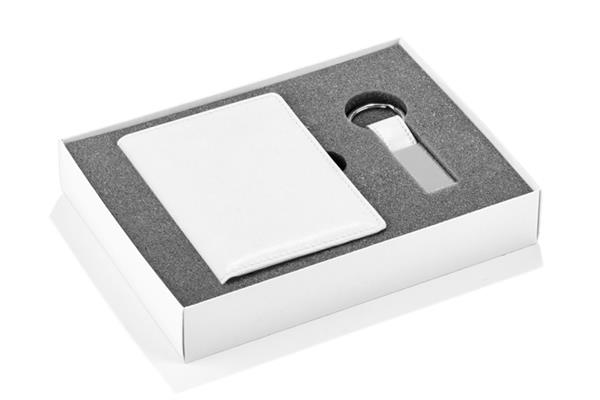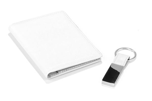 Zestaw CAMERON wykonany jest z materiału skóropodobnego (PU). Składa się z breloka oraz etui na dokumenty, które zapakowane są w pudełko wykonane z papieru. Kolor pudełka jest taki sam jak wnętrze zestawu, dzięki czemu tworzy spójną całość.